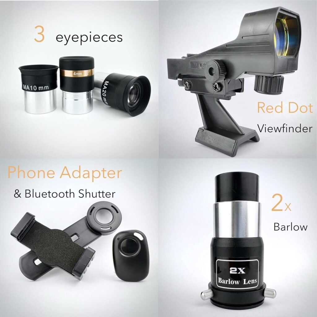 The complete eyepiece set includes 4mm aspherical (165x magnification) for planetary detail and lunar close-ups, 10mm MA (66x magnification) for general-purpose observing, and 20mm MA (33x magnification) for wide-field deep-sky viewing. The included 2x Barlow lens doubles each eyepiece’s magnification, providing six total magnification options from 33x to 330x maximum. This comprehensive range covers every observing scenario from sweeping star fields to examining planetary surface features. Plan observations with our Constellation Finder!